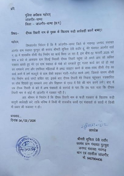 जांजगीर-चाम्पा। जिले में पत्रकारिता की आड़ में वसूली और दबंगई करने वालों का एक और मामला सामने आया है। नवागढ़ जनपद पंचायत अंतर्गत ग्राम पंचायत पुटपुरा में एक युवक द्वारा खुद को पत्रकार बताकर शासकीय निर्माण कार्य रुकवाने, पंचायत प्रतिनिधियों को धमकाने और पैसों की मांग करने का सनसनीखेज आरोप लगा है। ग्राम पंचायत पुटपुरा की सरपंच सुचिता देवी राठौर ने पुलिस अधीक्षक जांजगीर-चाम्पा को लिखित शिकायत देकर बताया कि 2 फरवरी 2025 को उनके पंचायत क्षेत्र के वार्ड क्रमांक 05 में सीसी रोड निर्माण का कार्य चल रहा था। इसी दौरान ग्राम तिलई निवासी दीपक तिवारी नामक युवक मौके पर पहुंचा और स्वयं को पत्रकार बताते हुए पंचायत प्रतिनिधियों पर दबाव बनाने लगा। शिकायत के मुताबिक युवक ने खुलेआम धमकी दी, मजदूरों को काम बंद करने के लिए उकसाया और मौके पर मौजूद महिलाओं से अभद्र व्यवहार किया। गाली-गलौज और हंगामे के चलते सीसी रोड निर्माण कार्य को घंटों तक रोकना पड़ा। यह सीधे-सीधे शासकीय विकास कार्य में बाधा डालने का मामला बताया जा रहा है। मामला यहीं नहीं रुका। आरोप है कि इसके बाद उक्त युवक सरपंच के निवास पहुंचा और पत्रकारिता का डर दिखाकर कथित विज्ञापन के नाम पर पैसों की मांग करने लगा। जब पंचायत स्तर पर अन्य सरपंचों से जानकारी ली गई तो चौंकाने वाला खुलासा हुआ कि दीपक तिवारी नाम का व्यक्ति जिले के किसी भी मान्यता प्राप्त समाचार पत्र, चैनल या मीडिया संस्थान से जुड़ा ही नहीं है। यानी पत्रकारिता के नाम पर पंचायतों को डराकर वसूली करने का खेल खुलेआम चल रहा है।सरपंच सुचिता देवी राठौर ने अपनी शिकायत में साफ कहा है कि यदि ऐसे फर्जी पत्रकारों पर सख्त कार्रवाई नहीं की गई तो पंचायत और अन्य शासकीय कार्यों में लगातार रुकावट डाली जाती रहेगी। उन्होंने पुलिस प्रशासन से इस फर्जी पत्रकार के खिलाफ कड़ी कानूनी कार्रवाई की मांग की है। जानकारों के मुताबिक़ पुलिस वालों से भी इस युवक ने वसूली की है और धमकाया है। ऐसे में अब बड़ा सवाल यह है कि क्या पत्रकारिता की साख से खिलवाड़ करने वाले ऐसे नकाबपोशों पर कानून का शिकंजा कसेगा? या फिर फर्जी पहचान के सहारे वसूली का यह खेल यूँ ही चलता रहेगा? इस मामले को लेकर पुलिस प्रशासन द्वारा जांच की बात कही जा रही है।